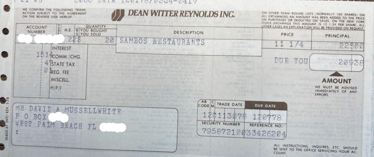 In college I became interested in how the stock market worked. My parents gave me $200 to invest and I went to a Dean Witter brokerage and purchased stock in Sambos restaurant. I think I chose this because I spent a lot of time in Sambos. As hoped the stock went up quite a bit and even split. However, I held on to it too long and the company went bankrupt.