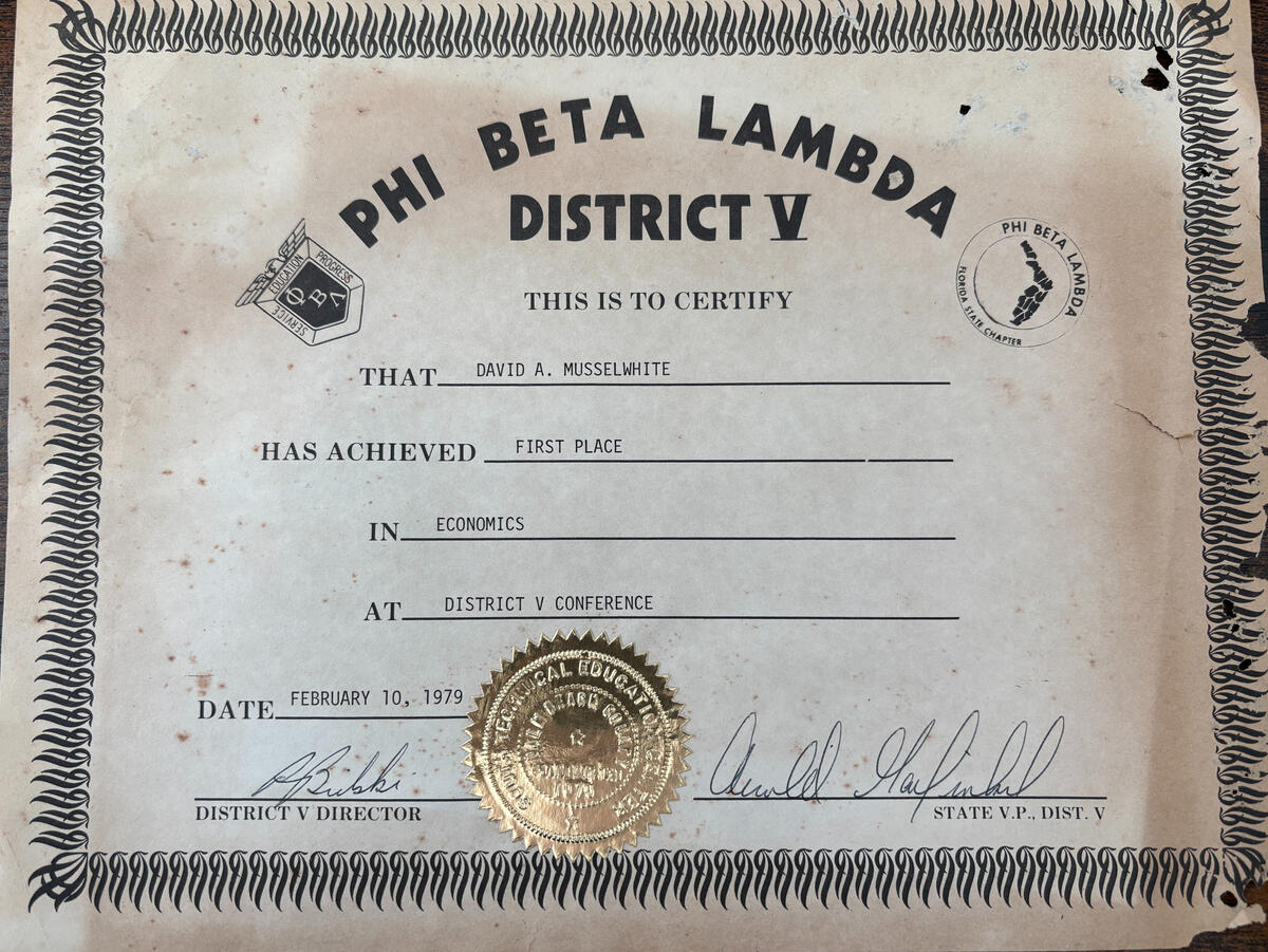 While I was a student at Palm Beach Atlantic College - I was the president to the business club called Phi Beta Lambda.One of the club activities was regional competitions. In 1979, I placed first in Economics for all of the south Florida District.
